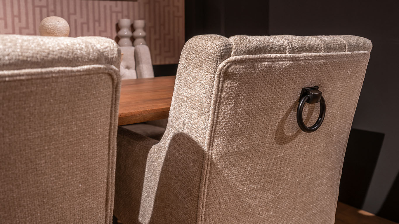 Geef elk detail jouw eigen signatuur: kies de kleur van het onderstel, de afwerking van de rug en een elegante handgreep als subtiele finishing touch. Met meer dan 200 meubelstoffen stel jij jouw Dionne volledig op maat samen. Zo creëer je een stoel die perfect past bij jouw