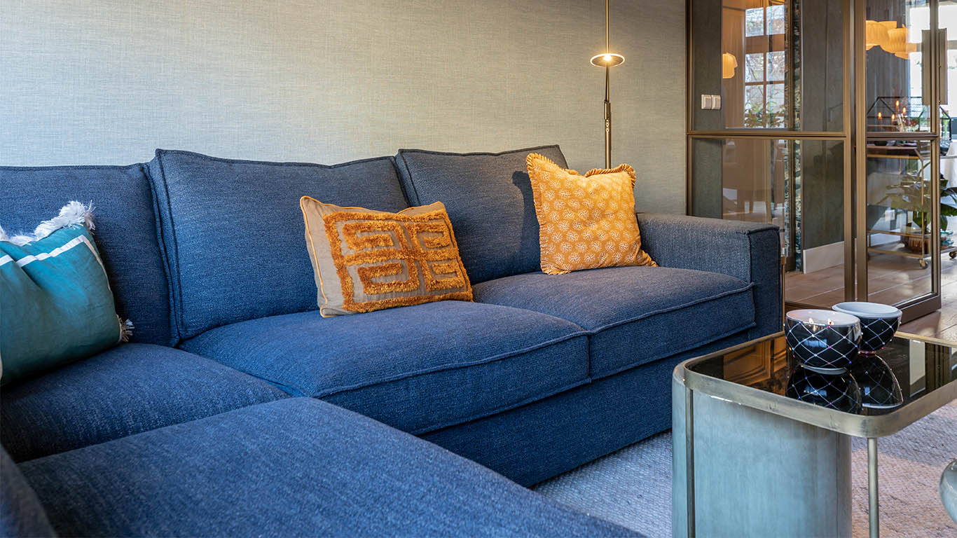 Voor deze make-over heeft Leonie een grote plofbank gebruikt, namelijk de Merano. Deze comfortabele bank is voorzien van een stoere, donkerblauwe stof en de kussens hebben een stoere, opstaande bies.