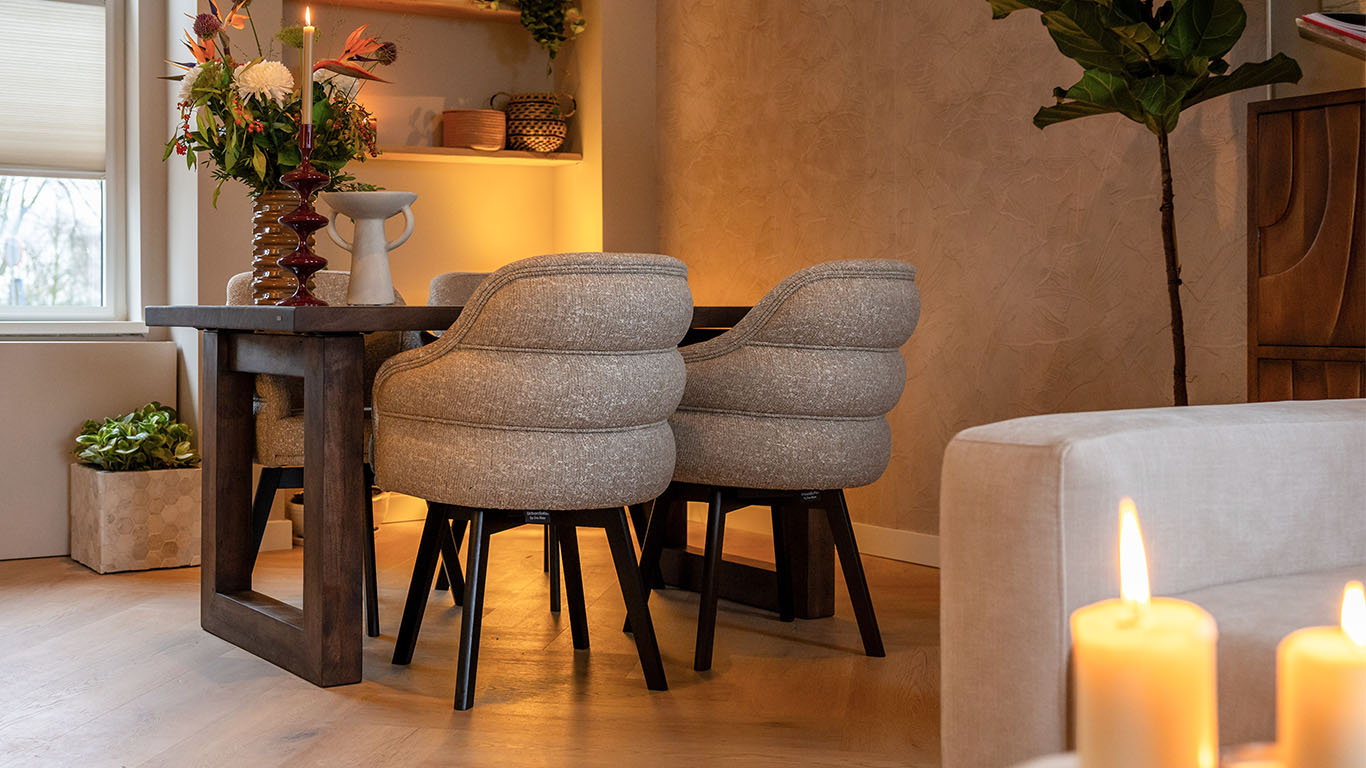 De Maud eetkamerstoel is een prachtige eyecatcher met strakke lijnen. Je stelt deze eetkamerstoel helemaal naar wens samen. Zo koos Laura voor een zwart, houten onderstel en dezelfde stof als de loungebank. Door de stof van zowel de bank als de eetkamerstoelen te combineren, creëer ik eenheid in het interieur.