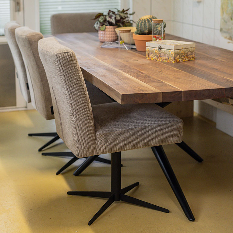 De kleur van je nieuwe eetkamerstoelen is erg belangrijk, zeker om een eenheid te creëren met je eettafel. Voor deze eethoek heeft Djamilla gekozen voor een natuurlijke kleur die goed past bij de rustieke kleur van het tafelblad. Het is een sterke stof die ook nog eens heerlijk zacht aanvoelt. De Odin eetkamerstoel heeft een breed zitvlak met interieurvering, dit zorgt ervoor dat je de hele dag comfortabel aan tafel zit! Dit model kun je geheel naar eigen wens personaliseren, zo is er gekozen voor een metalen draaipoot, deze is niet alleen erg stoer maar dankzij de draaifunctie kun je ook gemakkelijk plaatsnemen. Zo hoef je nooit meer te schuiven met je stoelen. Heel handig!
