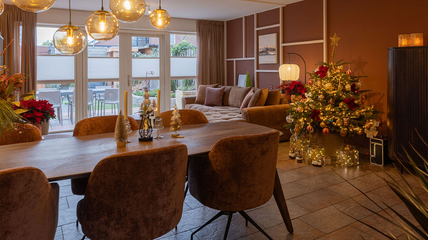 Om stijlvol en comfortabel aan de kersttafel te zitten heeft Djamilla gekozen voor de Evan eetkamerstoelen. De Evan kun net zoals alle andere modellen uit de UrbamSofa collectie helemaal zelf samenstellen. Voor deze samenstelling heeft Djamilla gekozen voor 3 eetstoelen mét armleuning, en drie zonder. Het stoere metalen onderstel is voorzien van een handige draaifunctie, ideaal bij het plaatsnemen of opstaan. Om een eenheid te creëren in de woonkamer heeft ze gekozen voor dezelfde stof als de Liam bank, alleen in een donkere, bordeauxkleur. Een perfecte match!