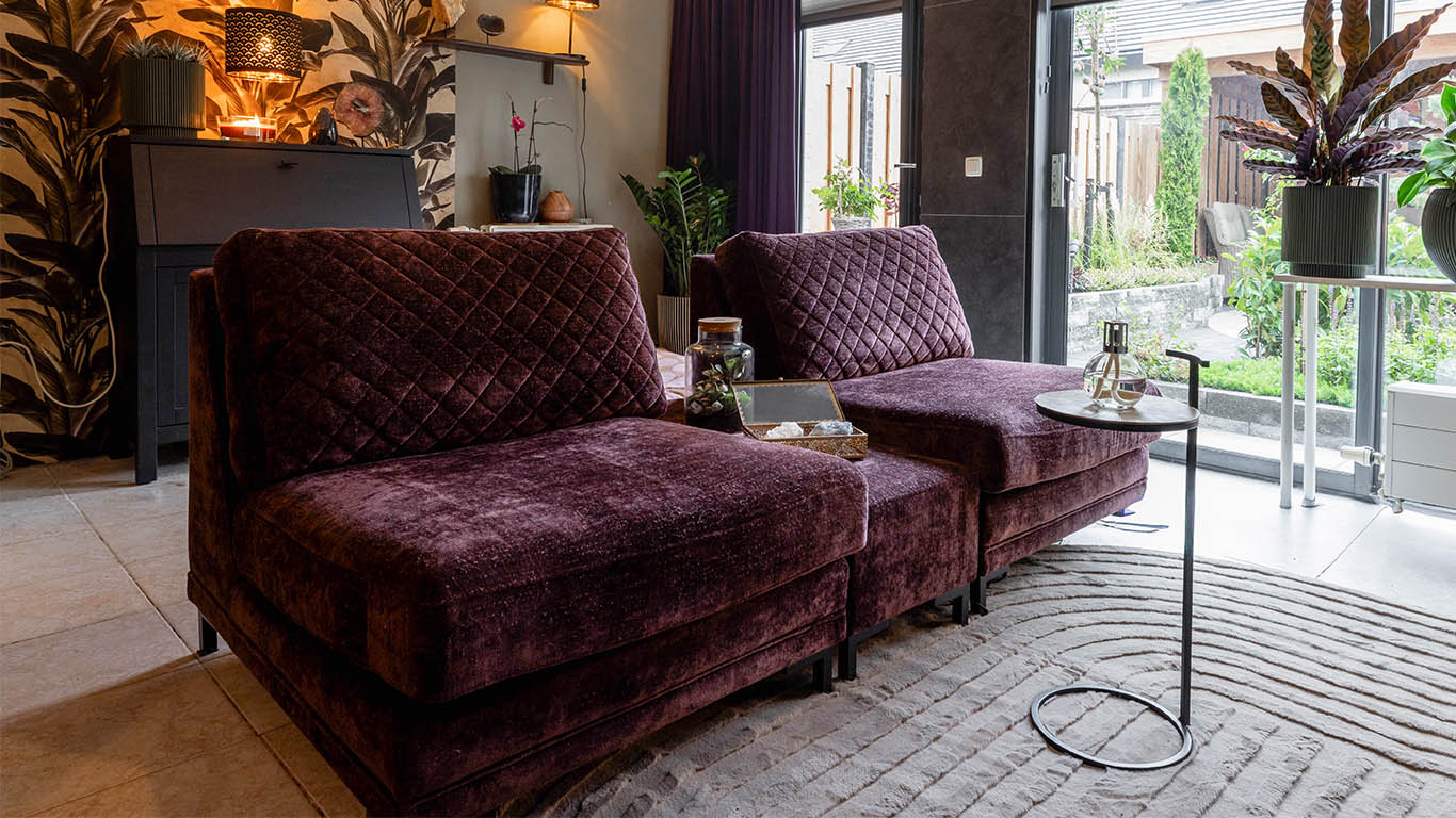 Voor deze woonkamer zocht Djamilla een speciale opstelling, deze heeft namelijk geen armleuningen en doorgestoffeerde zijkanten, hiertussen heeft ze een smalle comfortconsole hocker geplaatst. Ideaal om een dienblad of iets ander op te zetten.