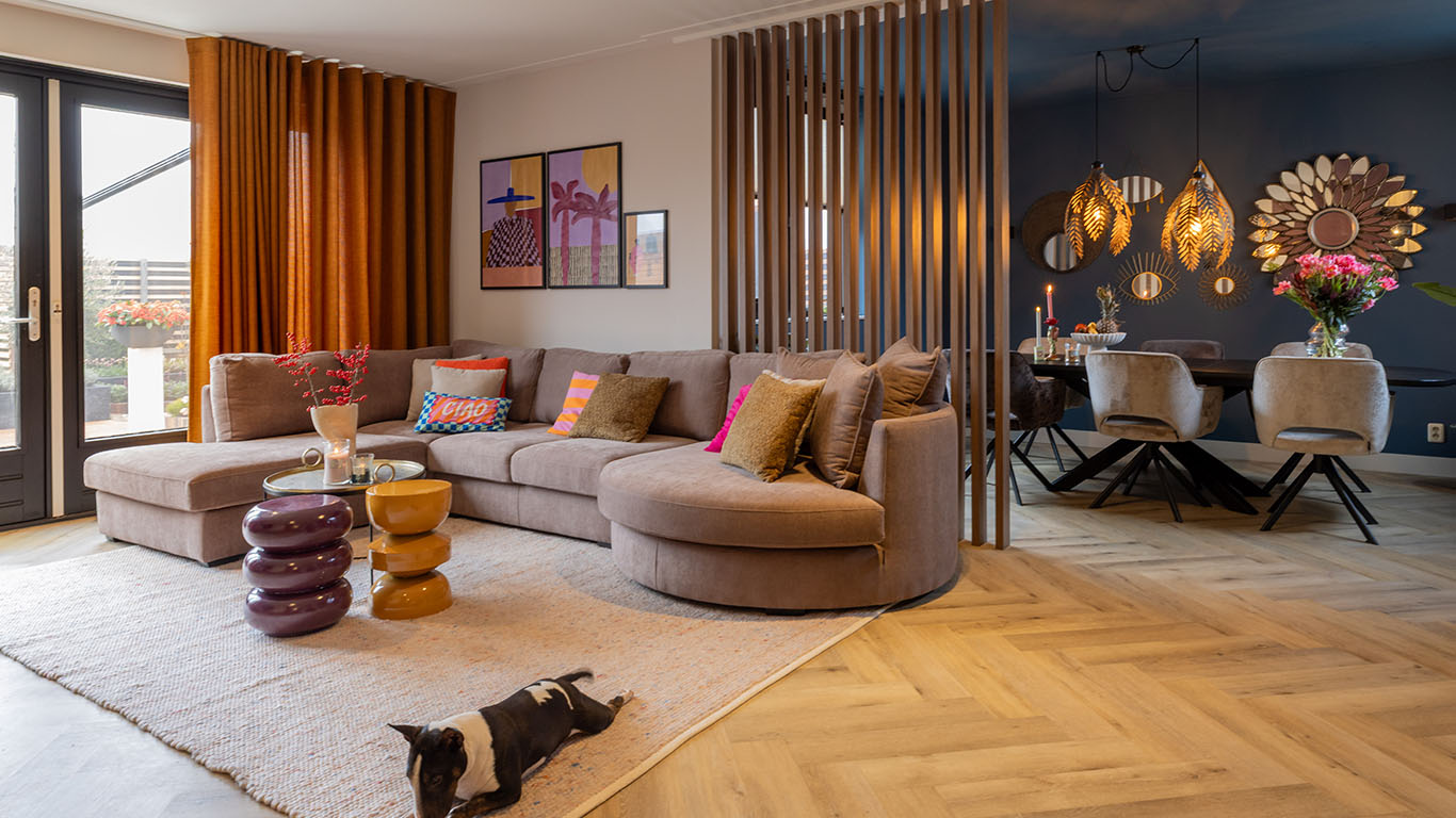 Djamilla zocht een grote hoekbank waar ronde vormen in zitten verwerkt: Dat is gelukt met deze grote Giorno hoekbank! Ze koos een opvallende stof zodat de bank lekker opvalt en dankzij de Premium Pock-IT Seats© zitkussens zit je heerlijk comfortabel.