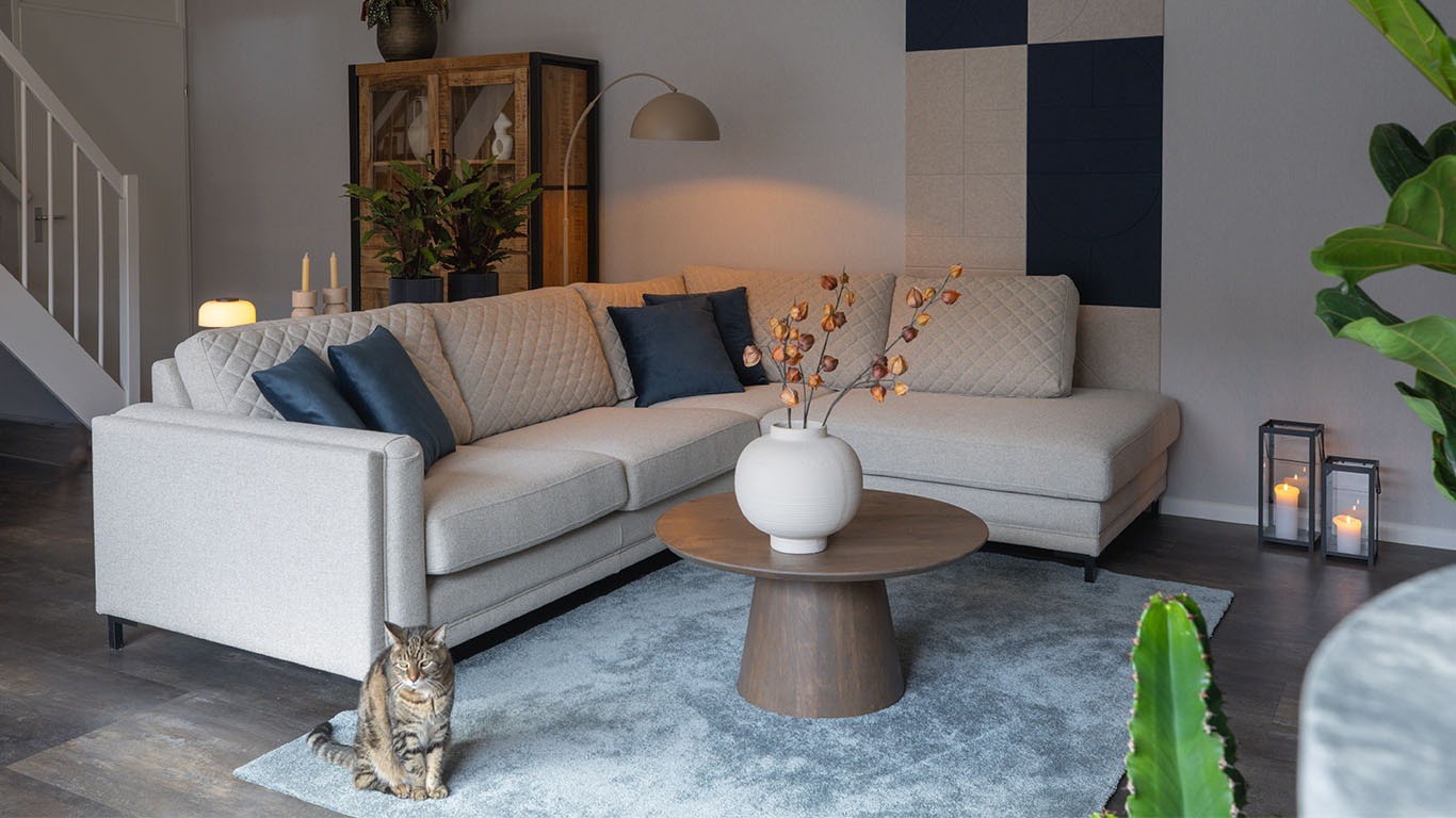 Voor deze woonkamer heeft Djamilla de Quinn hoekbank op het oog. Een mooi detail van de Quinn bank zijn de stijlvol afgewerkte armleuningen. Deze heeft een bies die van de leuning doorloopt over de romp van de bank. De hoge, metalen poten maken het plaatje helemaal compleet. De grove weving voelt zacht en heeft een lichte, natuurlijke kleur.
