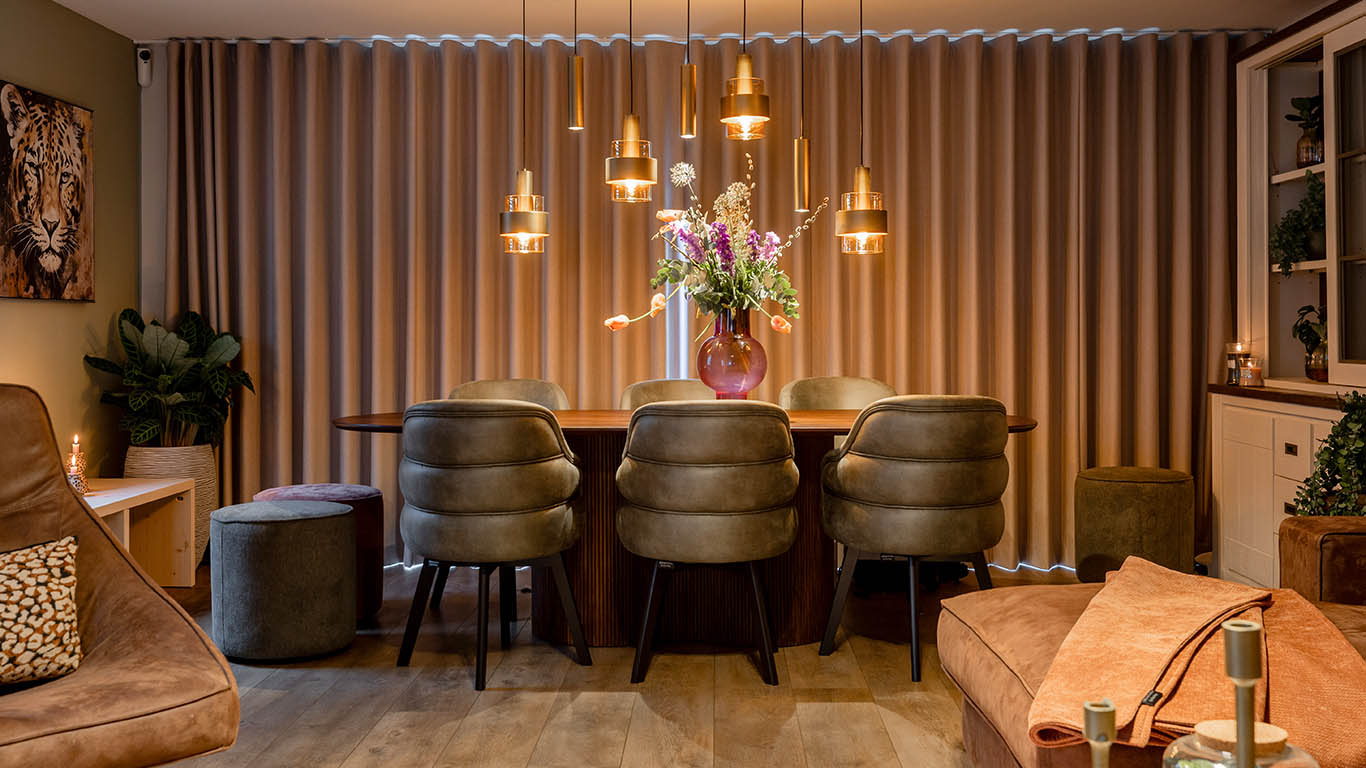 De groene keuken wordt mooi doorgetrokken naar de zithoek en eethoek, waardoor er meer samenhang ontstaat. Daarom heeft Djamilla gekozen voor de Evan barstoelen. Deze kun je ook helemaal naar wens samenstellen. Er is gekozen voor een tijdloos metaal onderstel die je in hoogte kunt verstellen. Djamilla zorgt voor een warm interieur met zachte tinten en hier en daar een speels detail van panterprintjes. Daarom koos ze voor de stof Cipriana Shiny Desert, die daar perfect op aansluit.