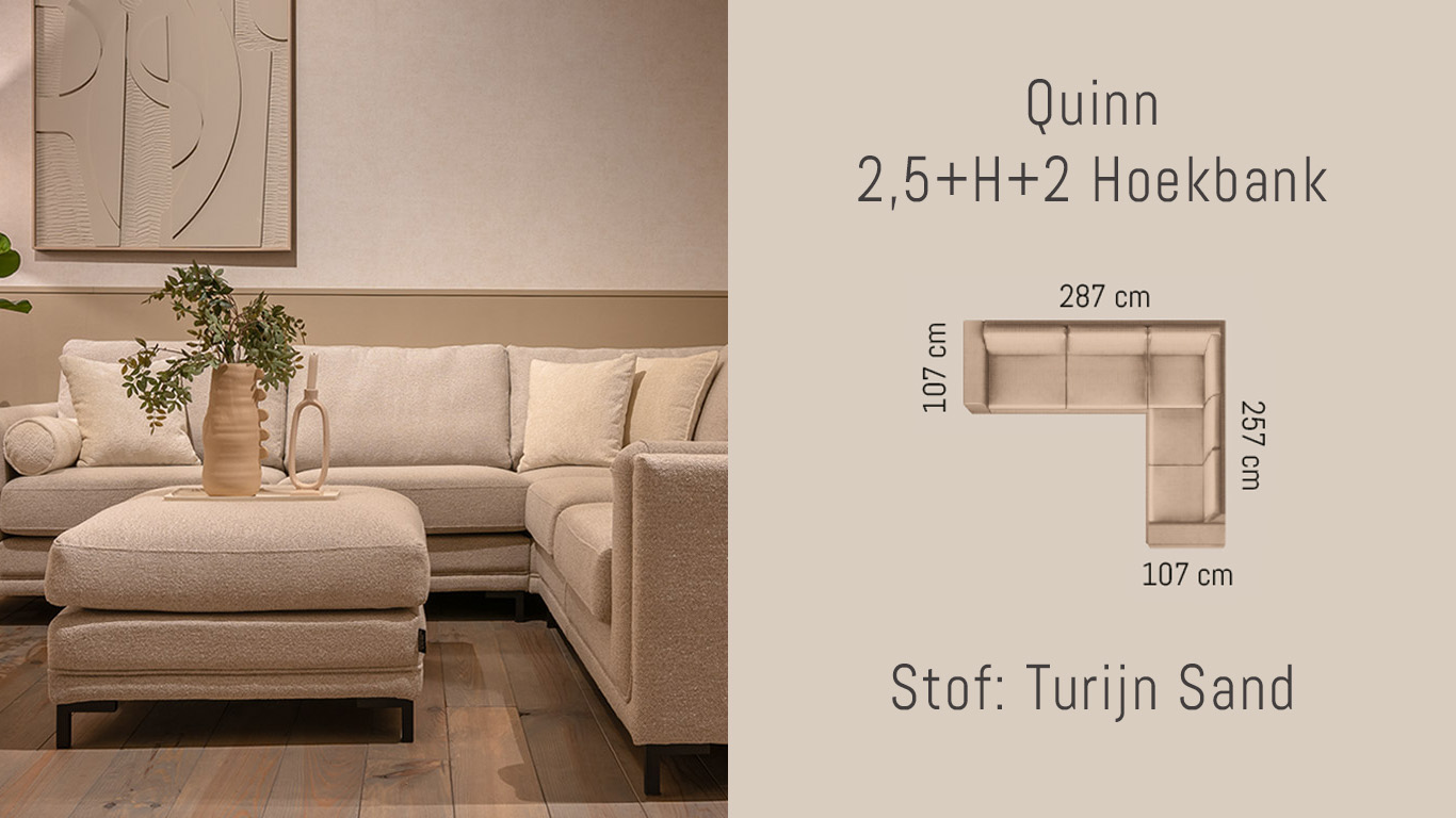 Deze Quinn hoekbank is voorzien van de prachtige Turijn Sand stof. Is hij zo perfect voor je? Bestel hem dan nu.Â